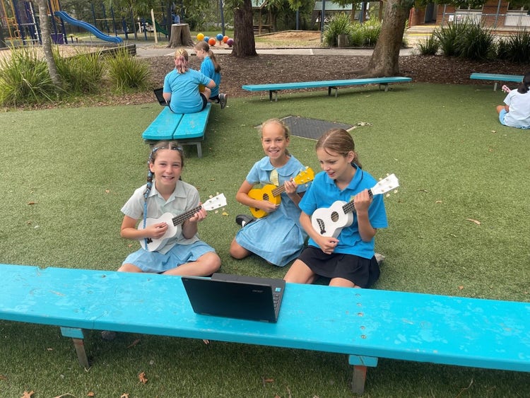 Students playing ukulele as part of weekly music lessons in one of our many outdoor seating areas